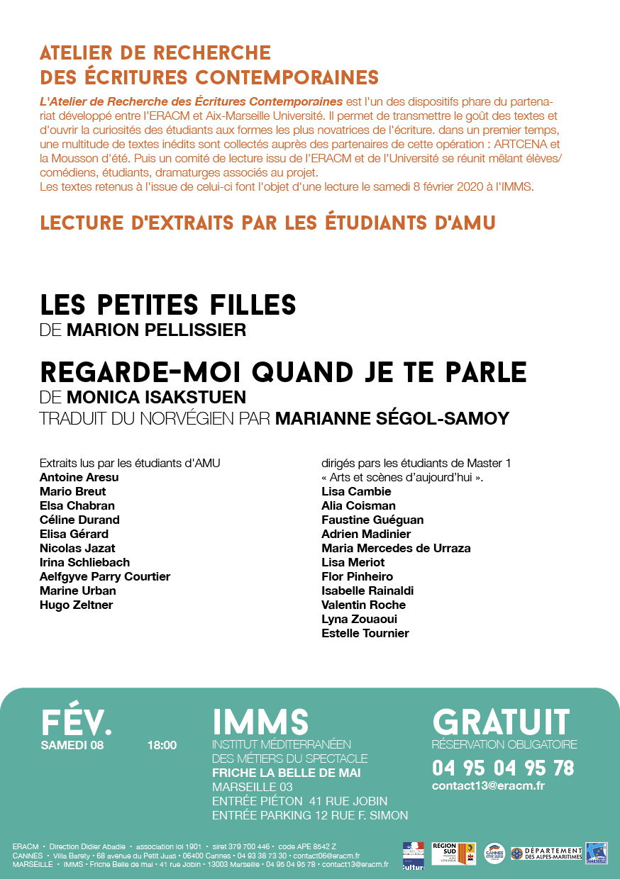 Les textes retenus à l’issue de celui-ci font l’objet d’une lecture, mise en voix par les étudiants du Master, et interprétée par les élèves-acteurs de l’ERACM associés à des étudiants de DEUST et Licence Arts de la scène d’Aix-Marseille Université le samedi 8 février 2020 à l’IMMS (Friche Belle de Mai)