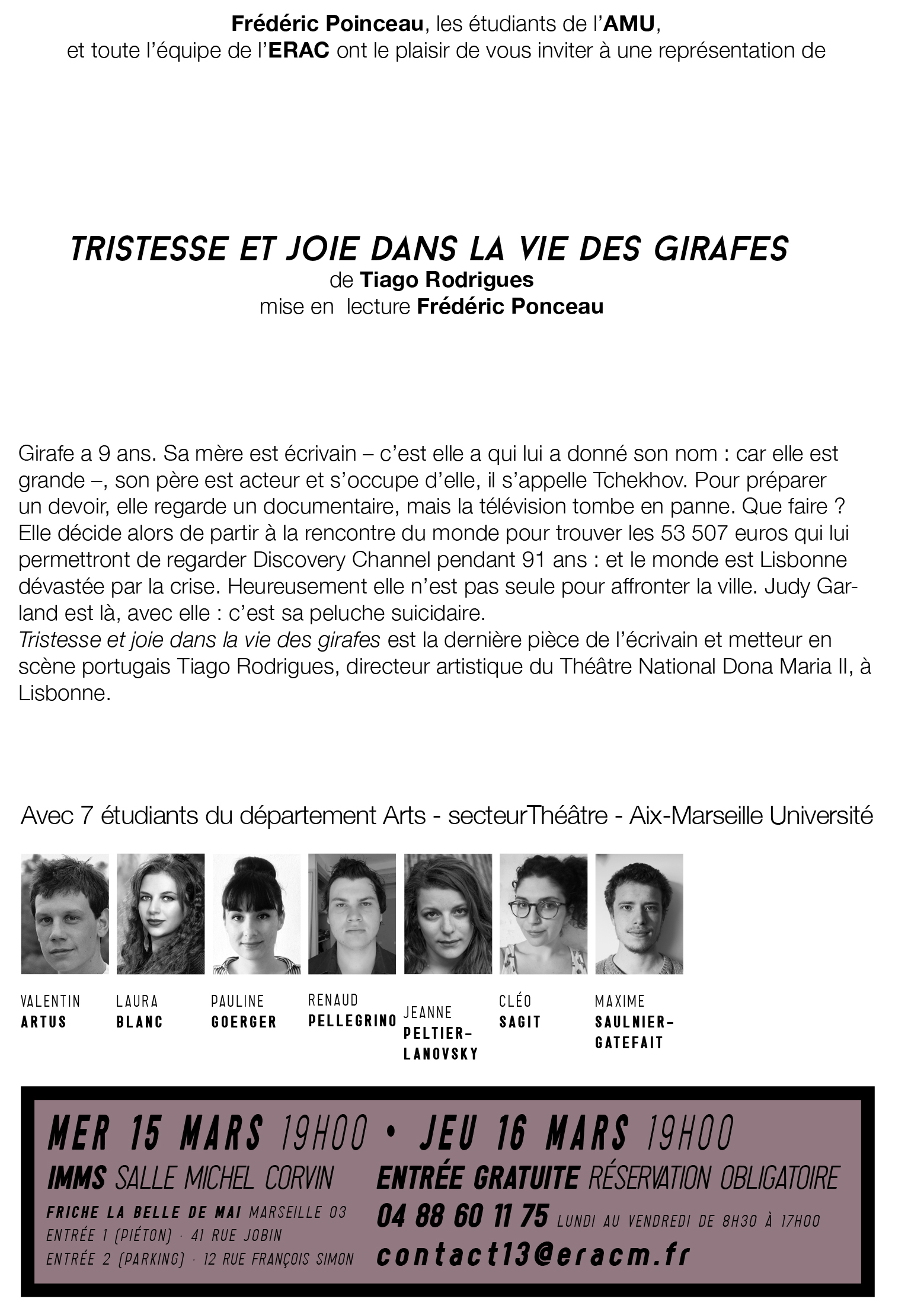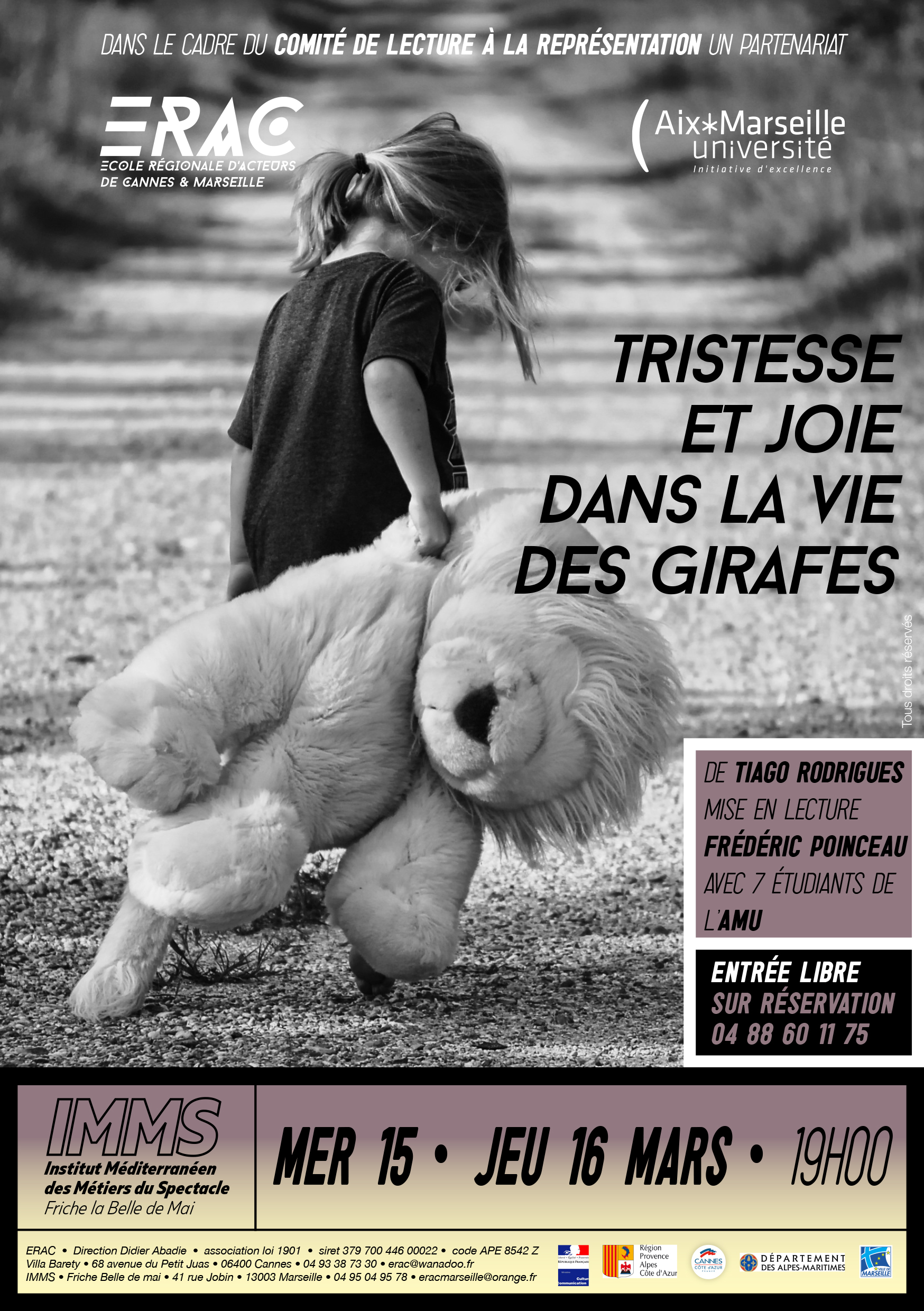 Mercredi 15 et jeudi 16 mars, à 19h, à l’IMMS (Friche Belle de Mai, Marseille), une mise en espace de Tristesse et Joie dans la vie des Girafes, dernier texte du dramaturge portugais Tiago Rodrigues, interprétée par les élèves du Master Pro 1 "Arts de la scène" d’AMU, mise en lecture par Frédéric Poinceau, dans le cadre du Comité de lecture à la représentation en partenariat avec l’École Régionale d’Acteurs de Cannes à Marseille.