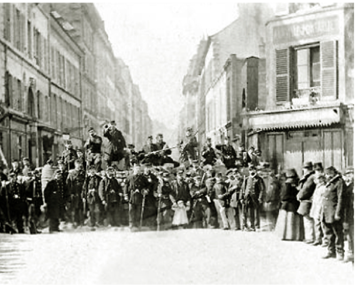 Le 28 janvier, le gouvernement demande l’armistice. Thiers, nommé chef du Pouvoir exécutif, a souci de signer la paix avec la Prusse et de soumettre Paris. Il cède à Bismarck l’Alsace et la Lorraine. Le 18 mars, alors qu’il tente de faire enlever les canons de Montmartre et de Belleville, la foule grandit et s’interpose devant les attelages. Les soldats fraternisent, la crosse du fusil en levée.