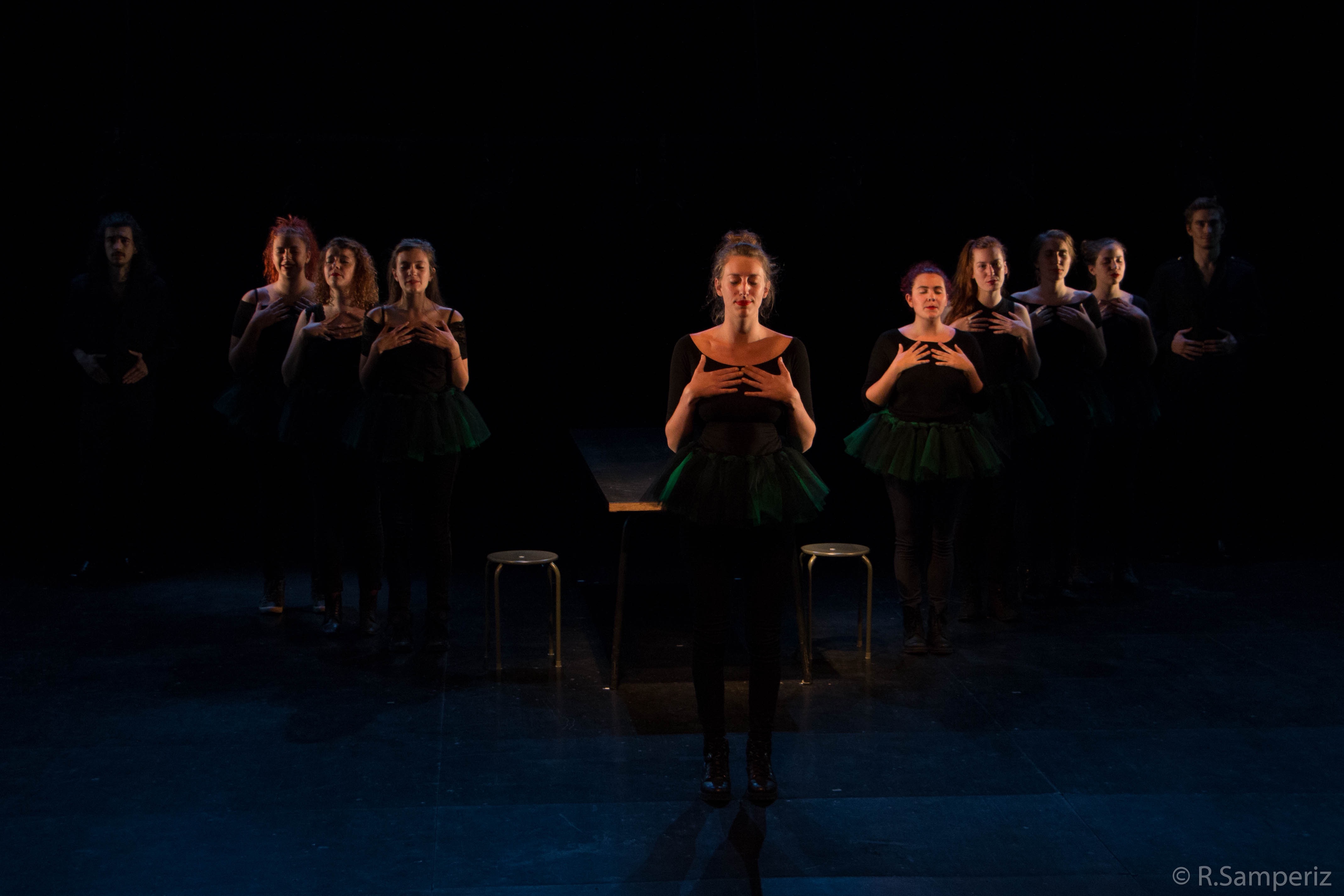 Une production universitaire est un travail intégré dans le cursus de formation Arts du spectacle d’Aix-Marseille Université. Un spectacle est créé sous la responsabilité d’un metteur en scène professionnel invité. Pour cette production le collectif artistique est au complet : Une metteure en scène, une assistant, treize acteurs, deux chargés de production et de médiation, deux créateurs lumières et sons, une scénographe, et une responsable costumes.
