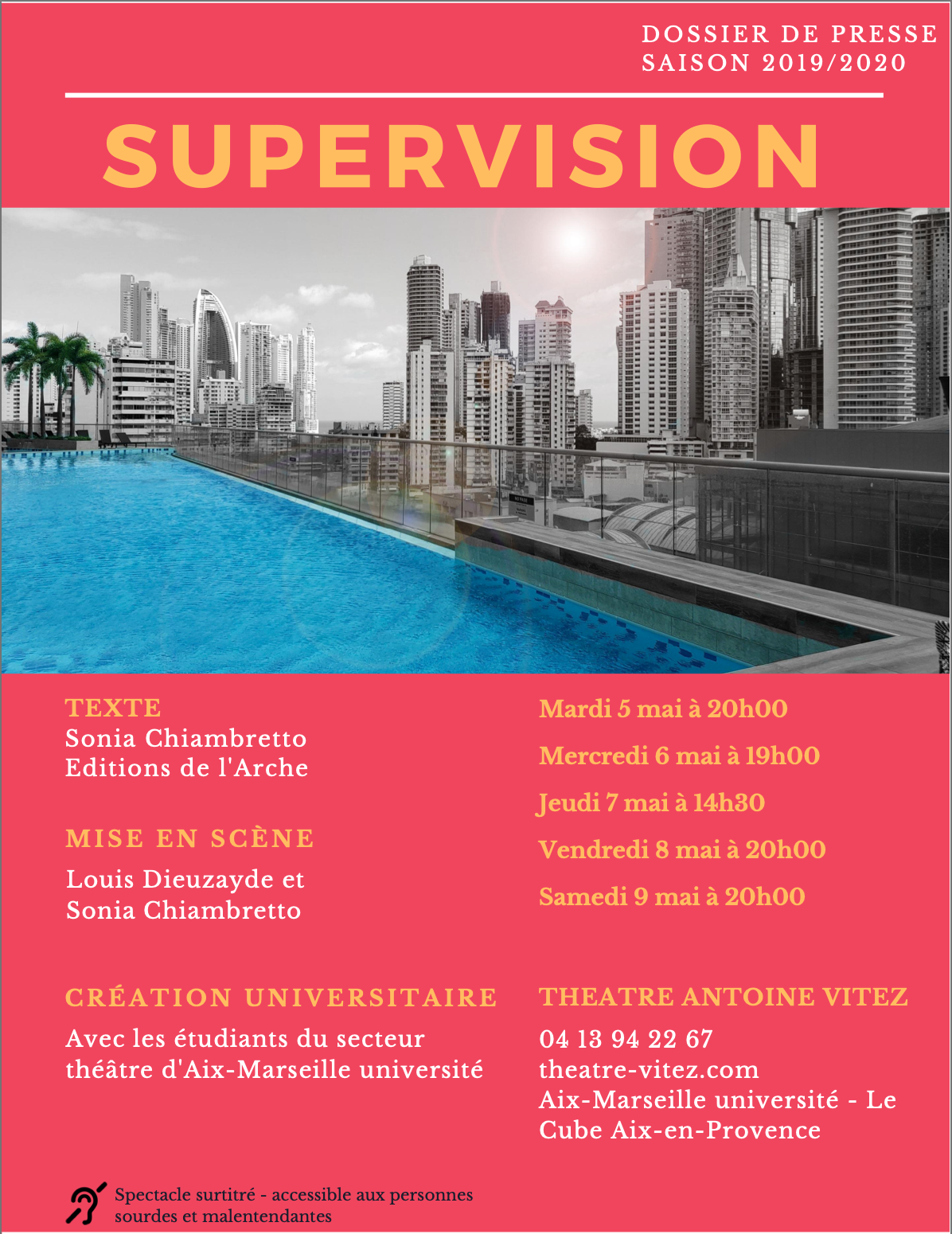 Sonia Chiambretto a publié en janvier 2020 le texte poétique Supervision, un texte qui mixte documents et fiction, de style objectiviste, sur les travailleurs de l’ombre de l’hôtellerie de luxe. Paroles et corps usés des employés du luxe ; intériorisation des langues managériales ; confessions et messes corporatistes ; gestes de travail ; sont maintenant rejoués lors des répétitions des acteurs dirigés par Louis Dieuzayde. Les espaces sont rebâtis devant la webcam. Chaque acteur, de son lieu intime, s’adresse au regardeur derrière l’écran. Il lui transfère le jeu des existences.