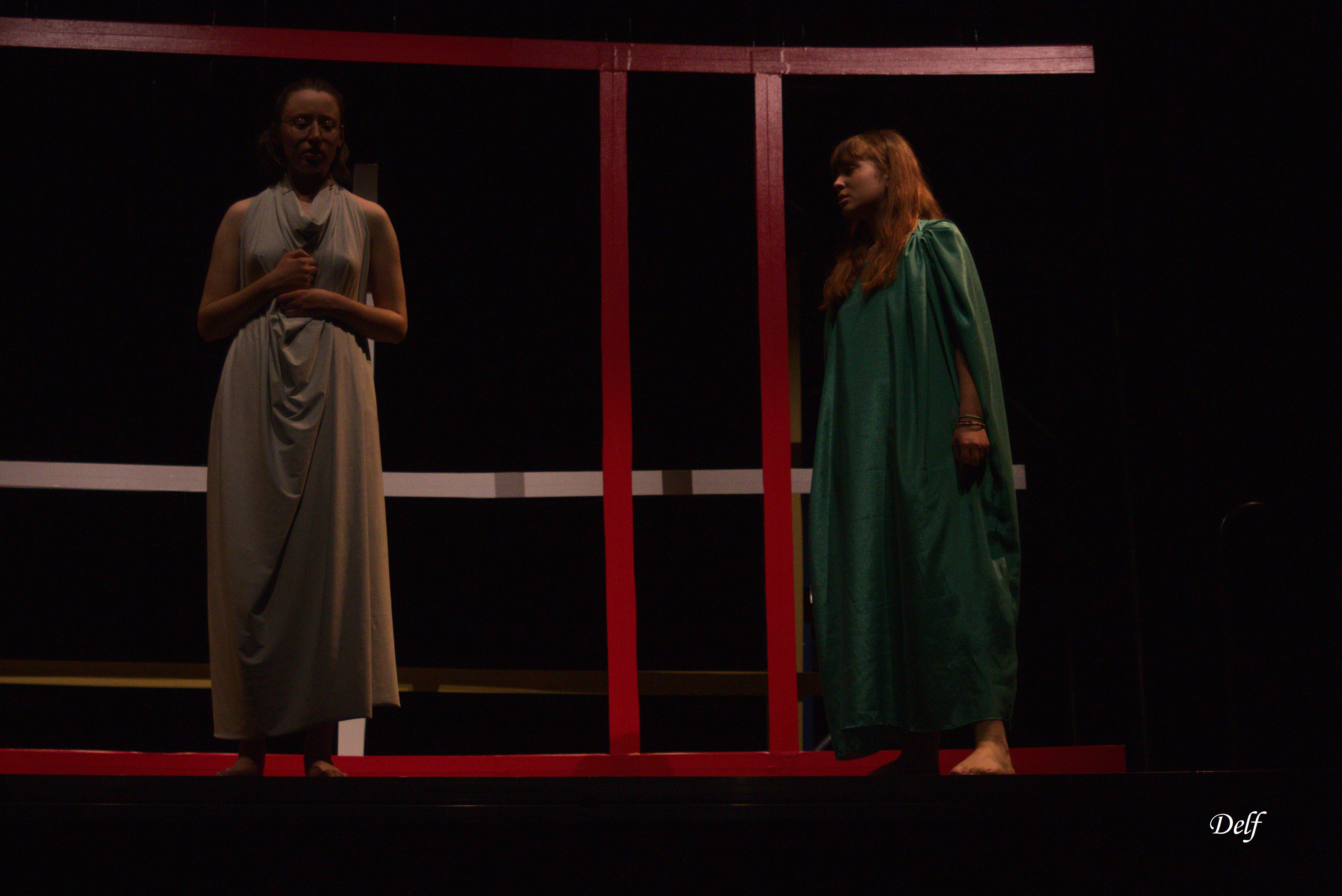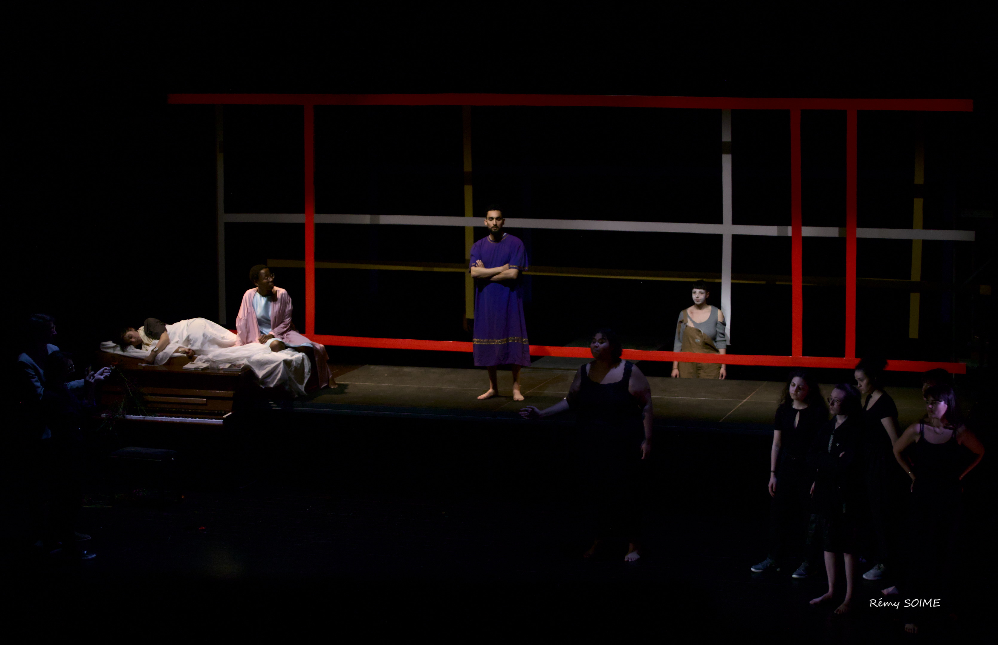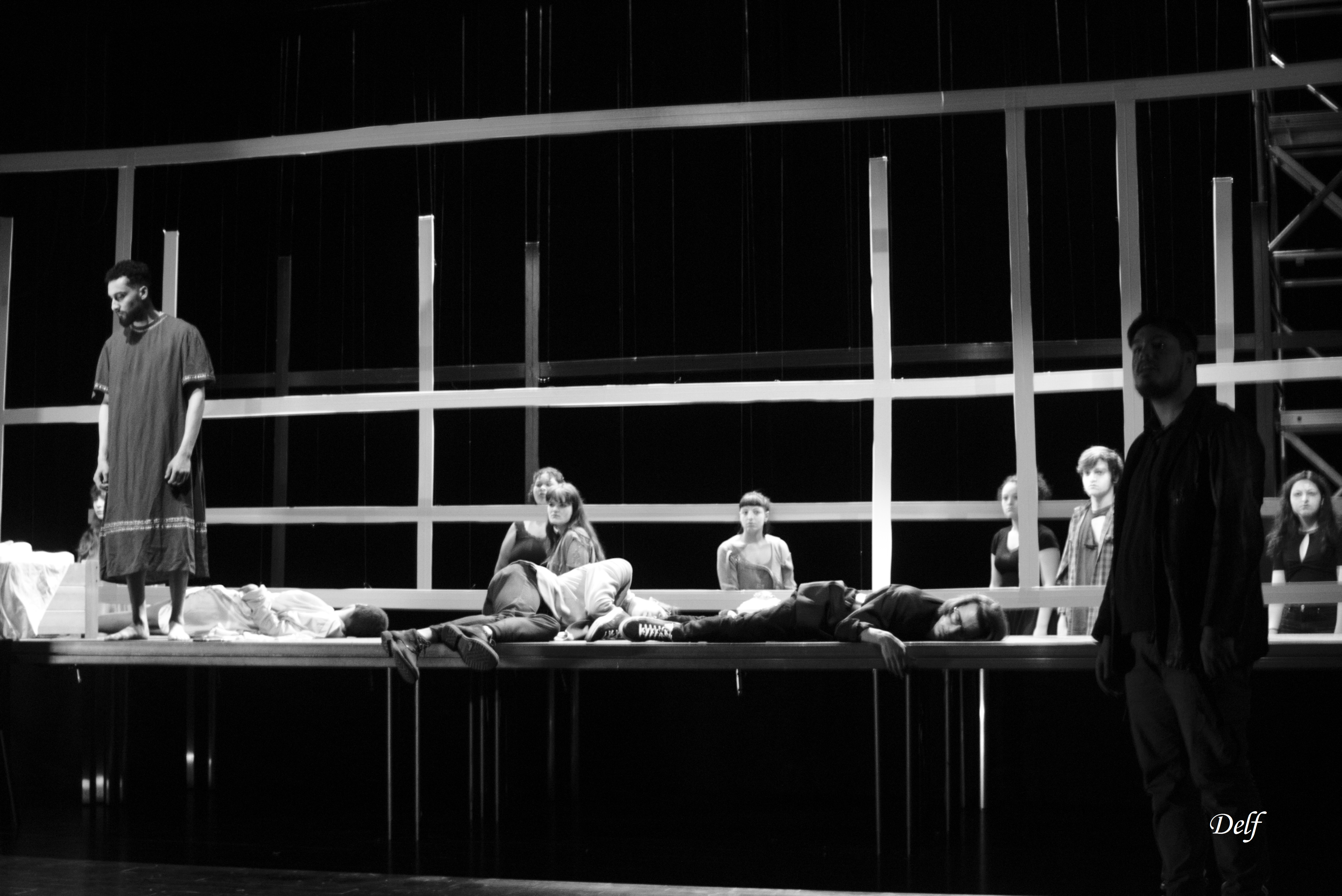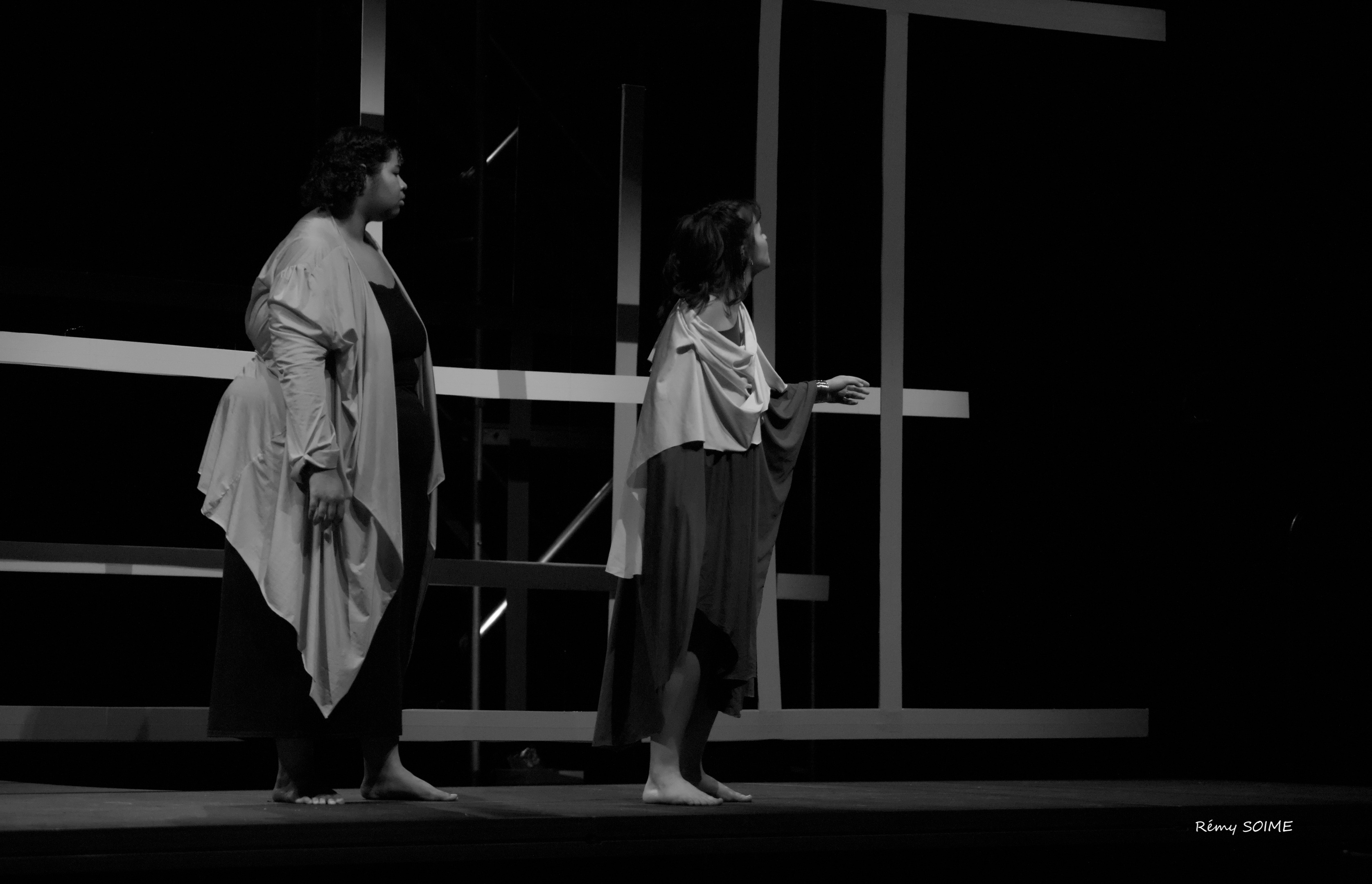 Sur la scène, la réhabilitation du héros tragique suppose en contre-point, la présence d’un chœur jouant « le public fictif d’un spectacle enchâssé ». Coupées du texte dramatique, les voix de ce chœur suspendent l’action pour évoquer une image passagère. À d’autres moments, en glissant sur les événements, elles font entendre une seconde parole qui reconstitue les morceaux de la fable comme le ferait un monteur de cinéma. Dans l’ombre, les voix du chœur peuplent la scène, interfèrent, commentent et fustigent. Elles chantent la mémoire des vaincus et leur deuil impossible.