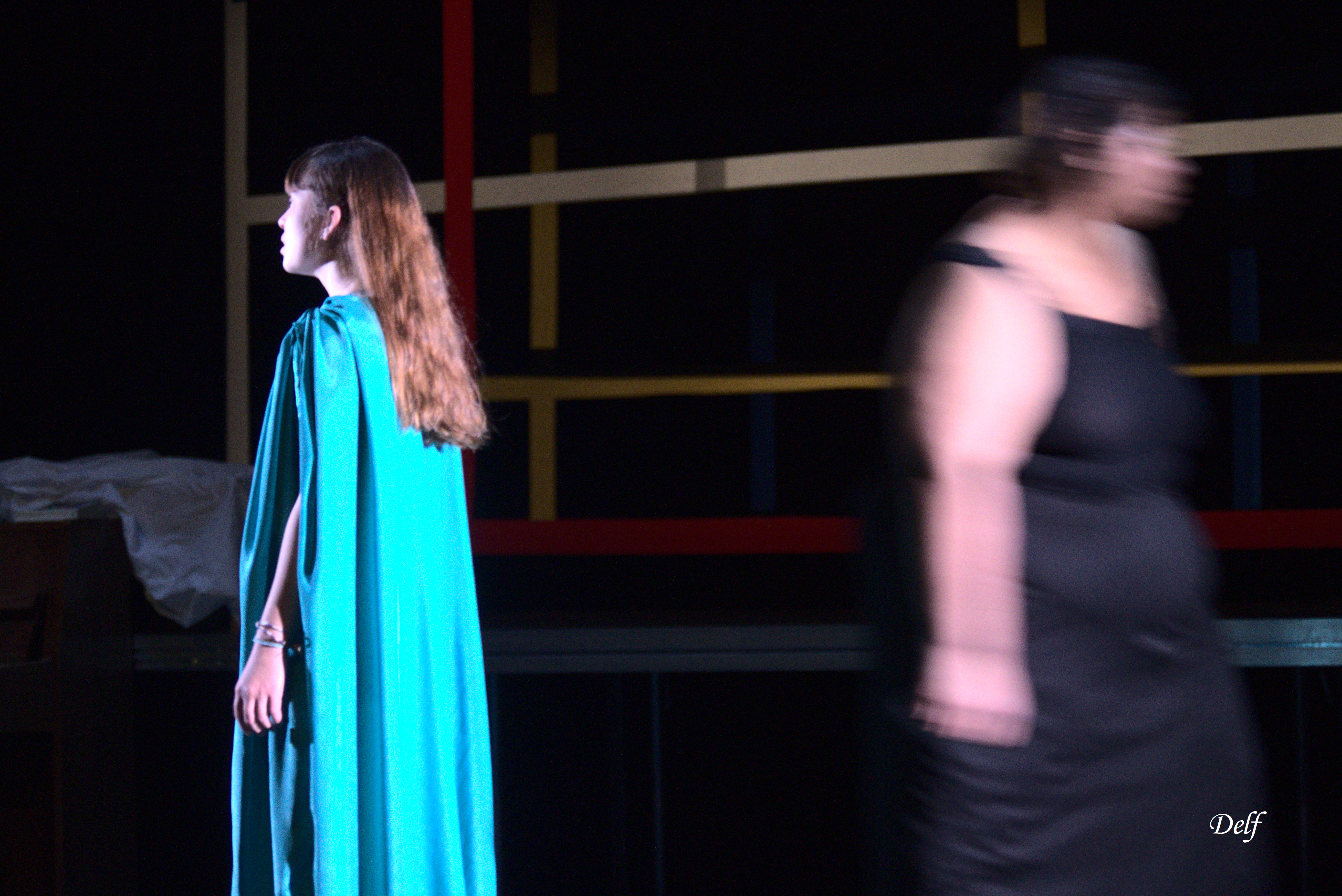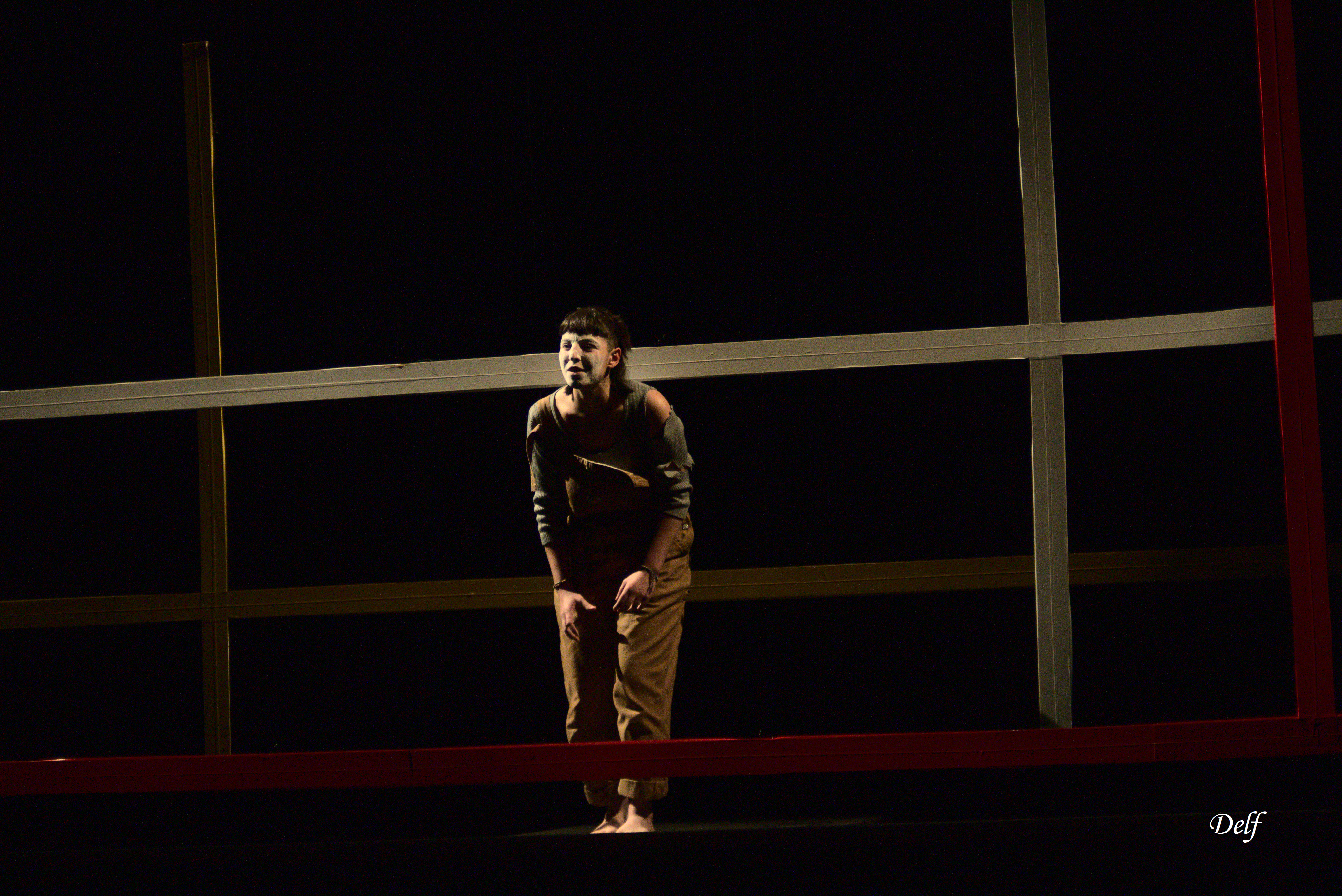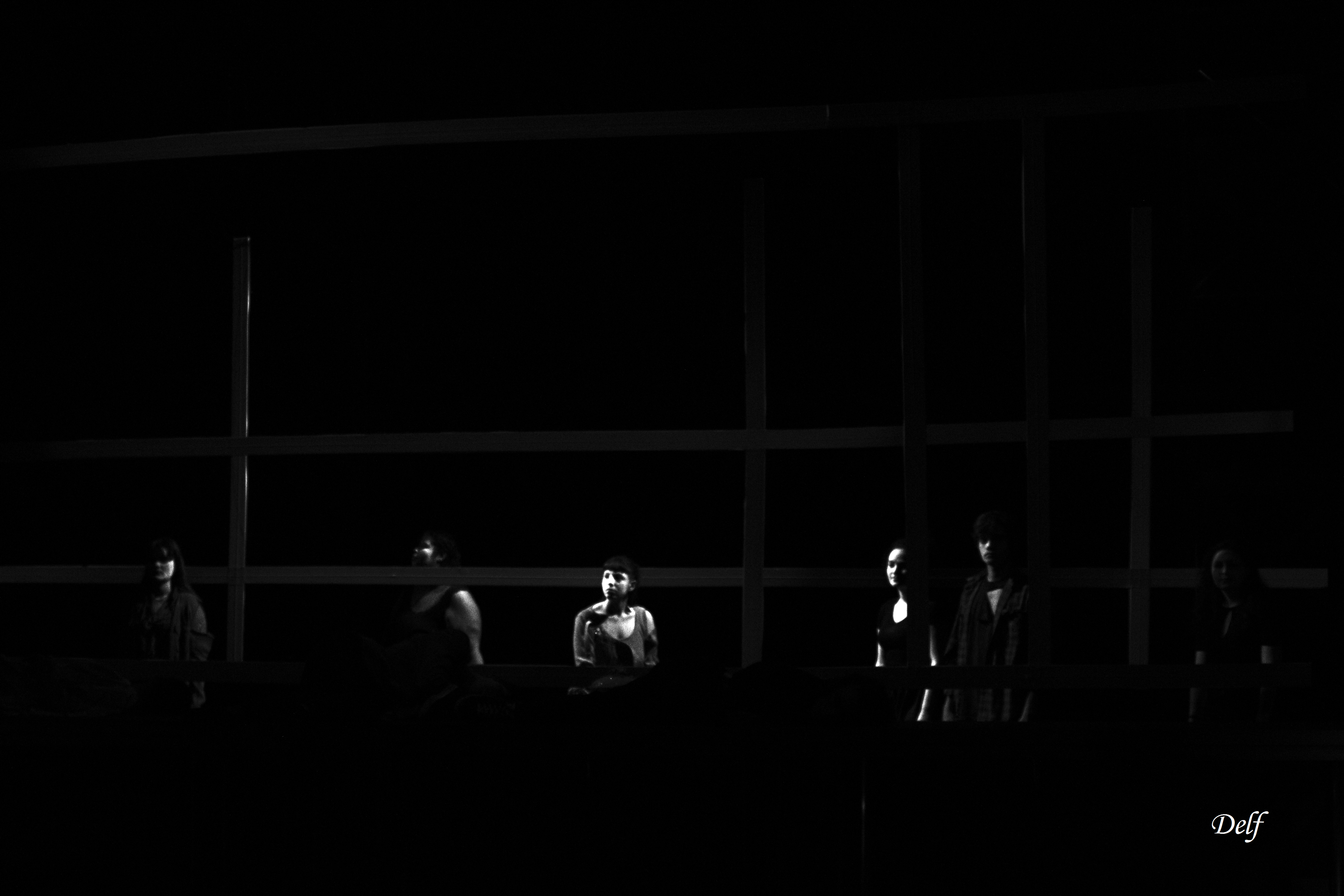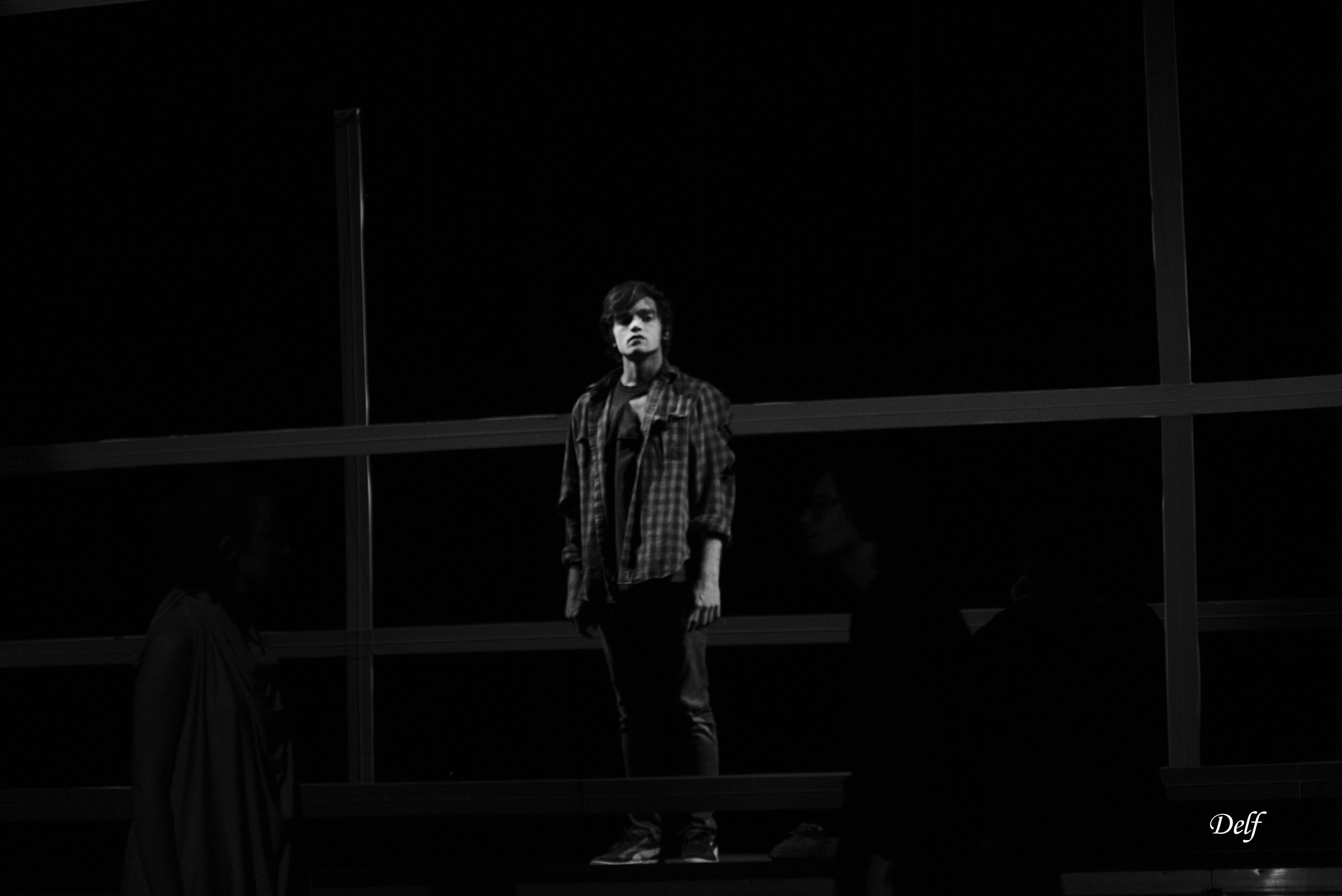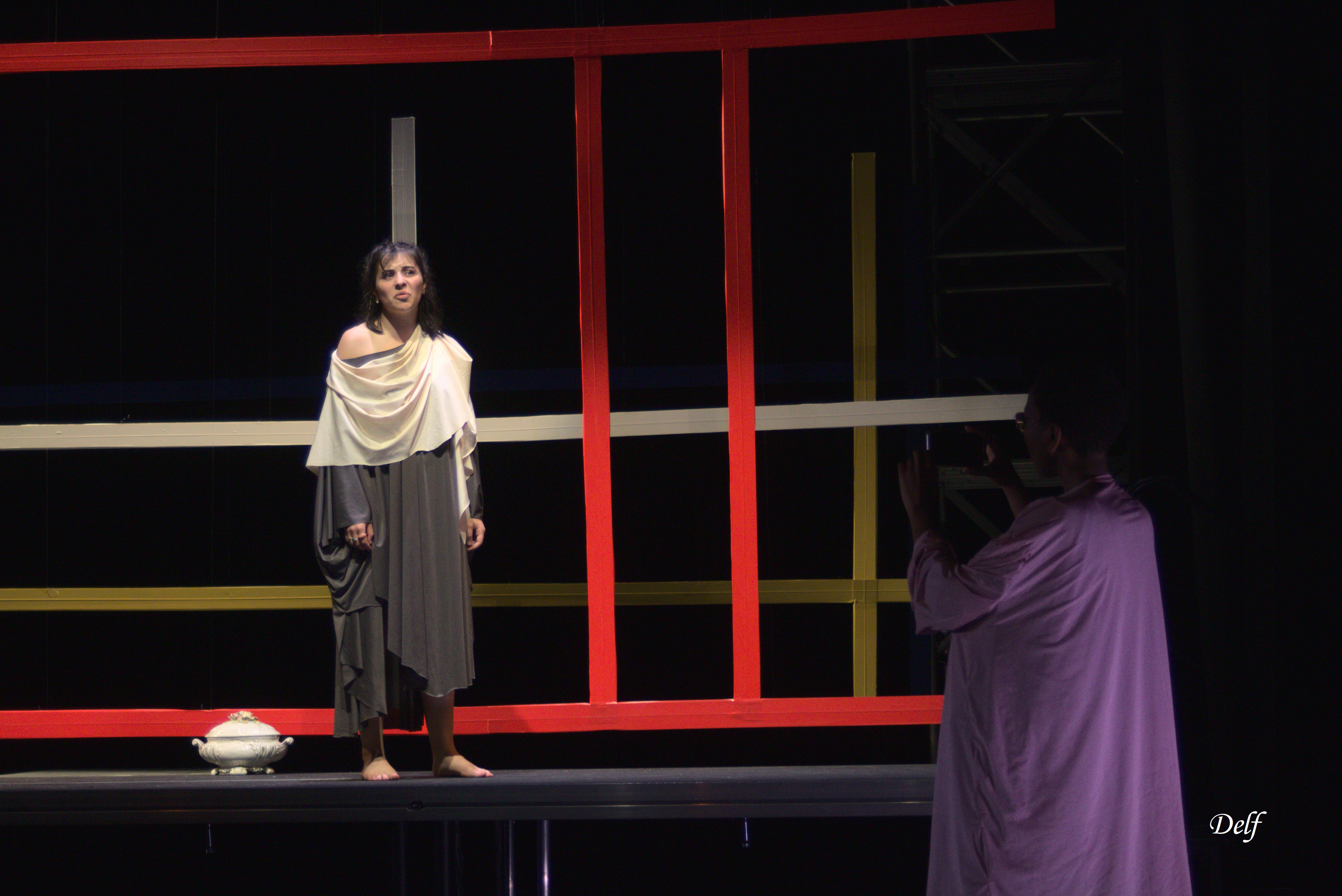 Sur la scène, la réhabilitation du héros tragique suppose en contre-point, la présence d’un chœur jouant « le public fictif d’un spectacle enchâssé ». Coupées du texte dramatique, les voix de ce chœur suspendent l’action pour évoquer une image passagère. À d’autres moments, en glissant sur les événements, elles font entendre une seconde parole qui reconstitue les morceaux de la fable comme le ferait un monteur de cinéma. Dans l’ombre, les voix du chœur peuplent la scène, interfèrent, commentent et fustigent. Elles chantent la mémoire des vaincus et leur deuil impossible.