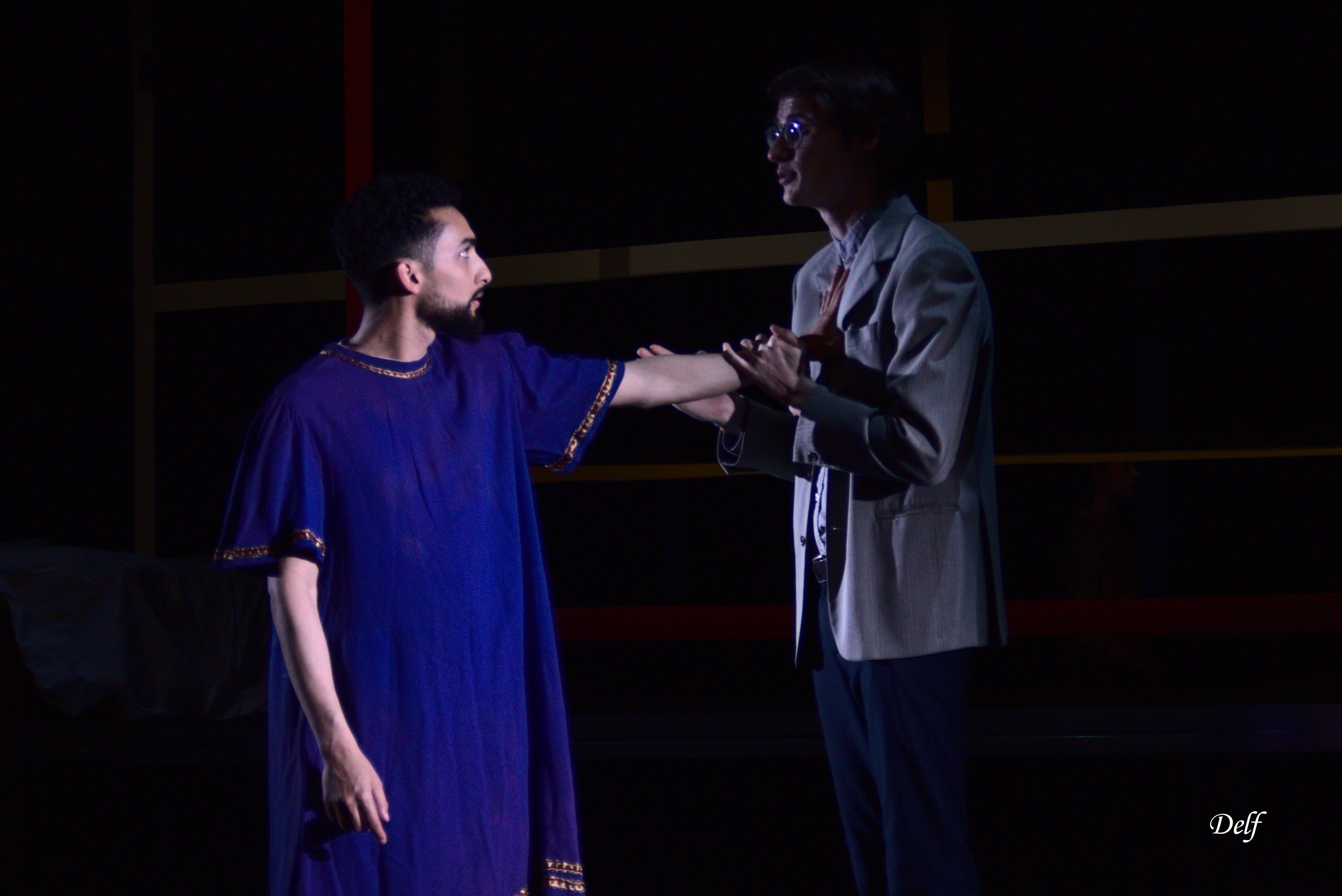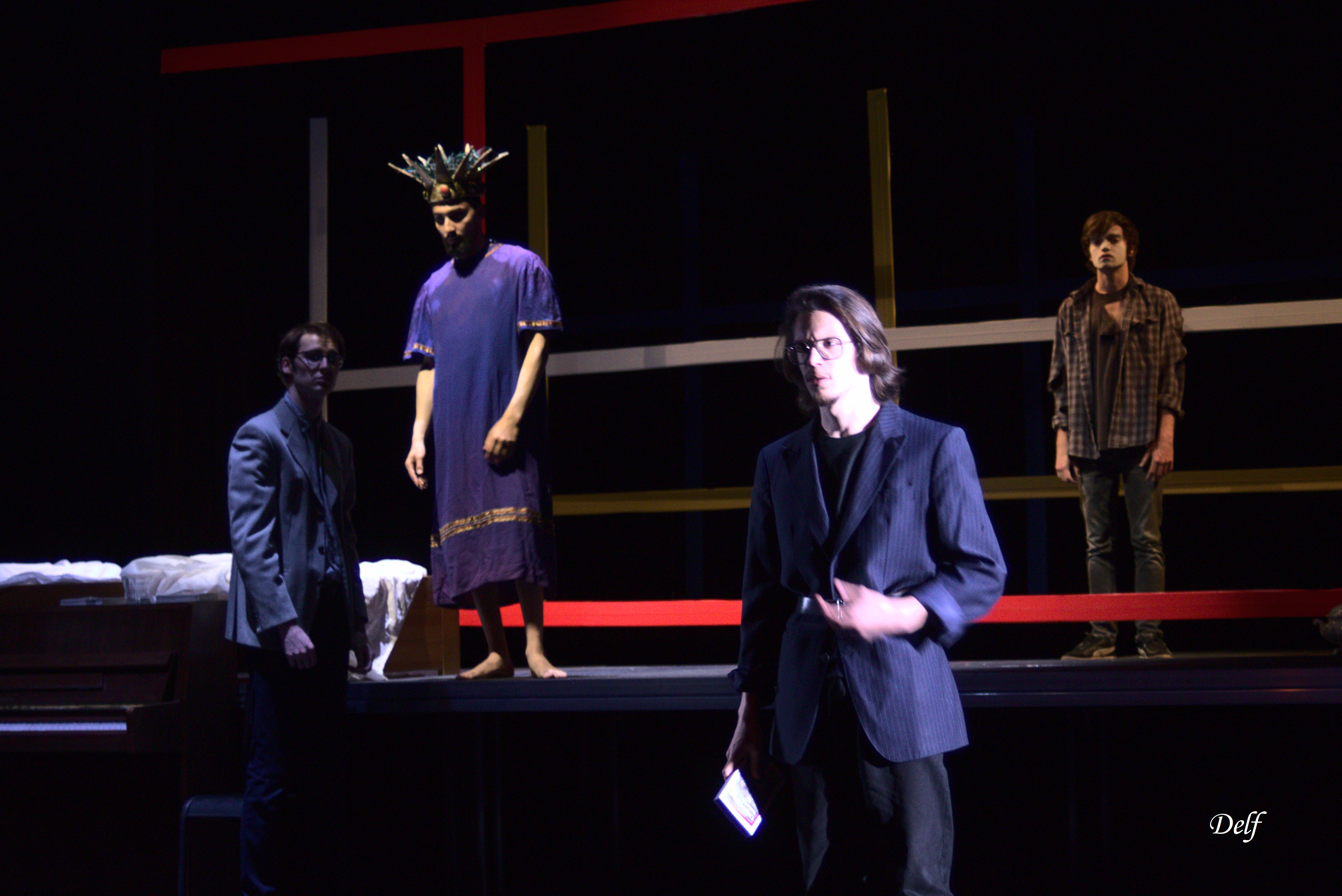 Avec le sacrifice de Thésée, le monde ancien et le monde contemporain se donnent à voir simultanément. Le décalage entre les valeurs de la Grèce antique auquel le héros s’identifiait et la société contemporaine qu’il appréhende, la confrontation de ces deux réalités, de ces deux époques met en exergue ce qui les distingue. Le corps du texte se découpe ainsi en plusieurs plans d’énonciation qui vont de la conversation à la déclamation. Les acteurs doivent réussir à passer insensiblement de l’un à l’autre pour produire cet effet d’éloignement critique.