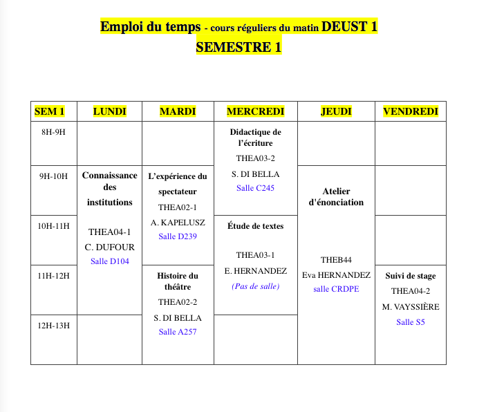 — Mme Marie VAYSSIÈRE : Vendredi 13h30/14h30 (Semestre 1) | Jeudi 13h30/14h30 (Semestre 2)