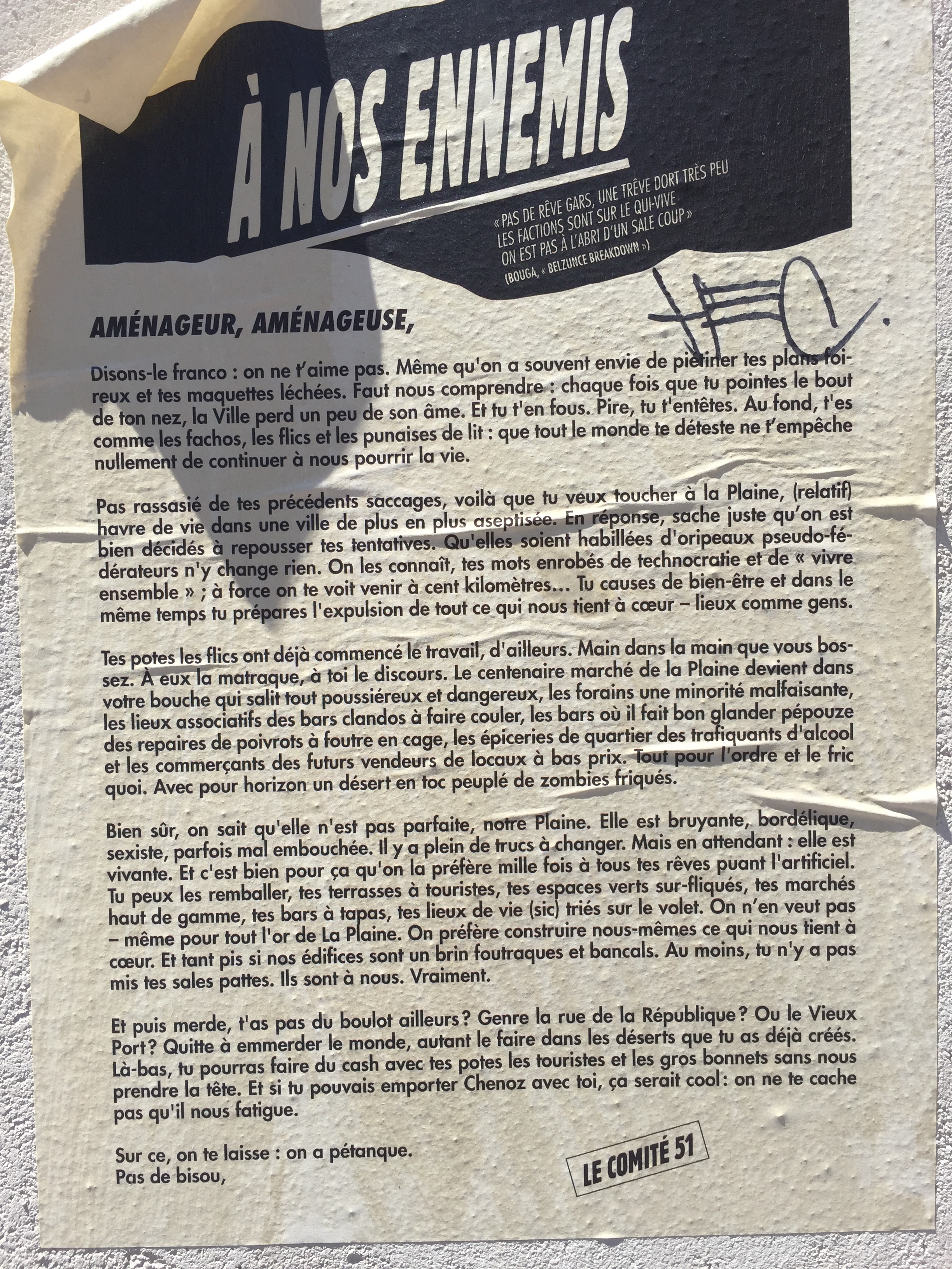 Affiche concernant l’aménagement du quartier de la Plaine, Marseille (juin 2017)